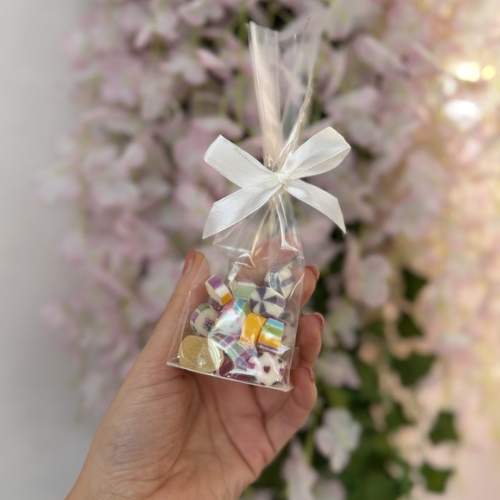 Każda paczuszka zawiera mix kolorowych cukierków o różnych smakach i wzorach, które zachwycają zarówno wyglądem, jak i smakiem. Całość zapakowana jest w celofan i przewiązana elegancką białą wstążką - gotowa do wręczenia od razu.